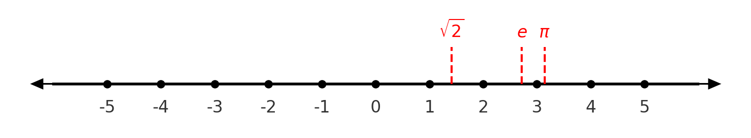 מבחינת הקורס, המספרים האי-רציונליים הרלוונטיים הם בעיקר שורשים כמו \(\sqrt{2}\) שהם יחסית נוחים לחישובים. אבל טוב לזכור שיש המון מספרים אי-רציונליים (יותר מאשר מספרים רציונליים במובן מסוים), והם משלימים את המספרים הרציונליים למה שנקרא הישר הממשי. ניתן לחשוב על המספרים כנקודות על ישר עם ראשית \(0\). המספרים החיוביים מופיעים בצד ימין, ואילו המספרים השליליים מופיעים בצד שמאל.