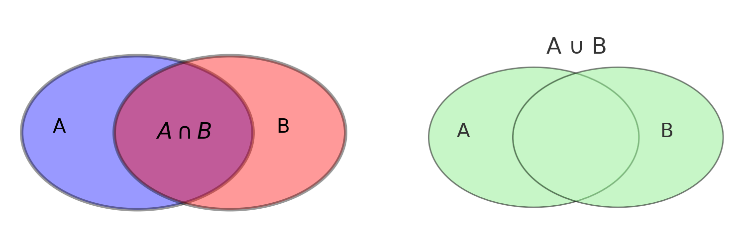 עבור \(A=\Set{1,2,3},\,B=\Set{2,3,4}\) מתקיים \[ A\cap B=\Set{2,3},\,A\cup B=\Set{1,2,3,4}. \]