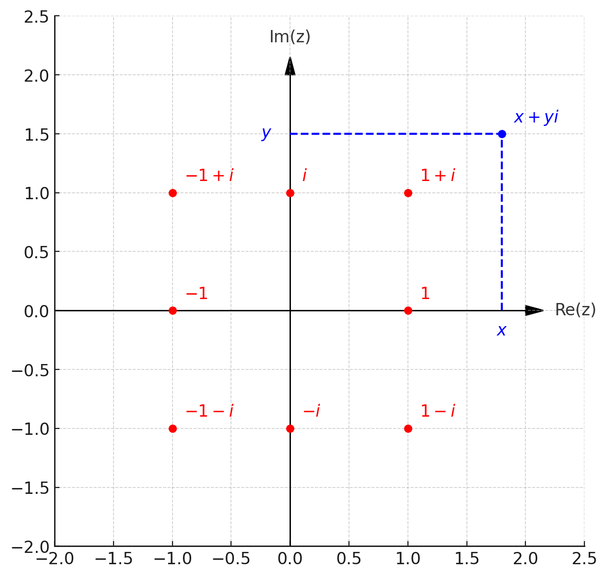 Remark. נראה בהמשך שחיבור של מספרים מרוכבים שקול לחיבור בין שני וקטורים במישור, ואכן ניתן לייצג כל מספר מרוכב \(z=x+yi\) כנקודה/וקטור במישור עם קוארדינטות \((x,y)\). קוארדינטות אלו נקראות קרטזיות.