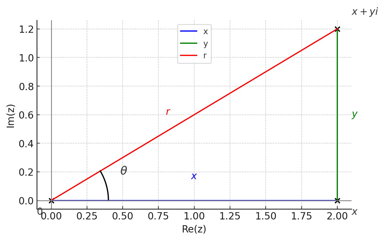 יש דרך אחרת לתאר נקודה במישור. במקום להסתכל על ההיטלים \(x,y\) על הצירים, אפשר להסתכל על המרחק \(r\) מהראשית ועל הזווית \(\theta\) שנוצרת בין הוקטור שיוצא אל הנקודה לבין הכיוון החיובי של הציר הממשי (ציר \(x\)). הקוארדינטות \((r,\theta)\) נקראות קוארדינטות פולריות (קוטביות), ונדגיש שהזווית \(\theta\) נמדדת ברדיאנים. בפרט, נכתוב \(\pi\) במקום \(180^\circ\).