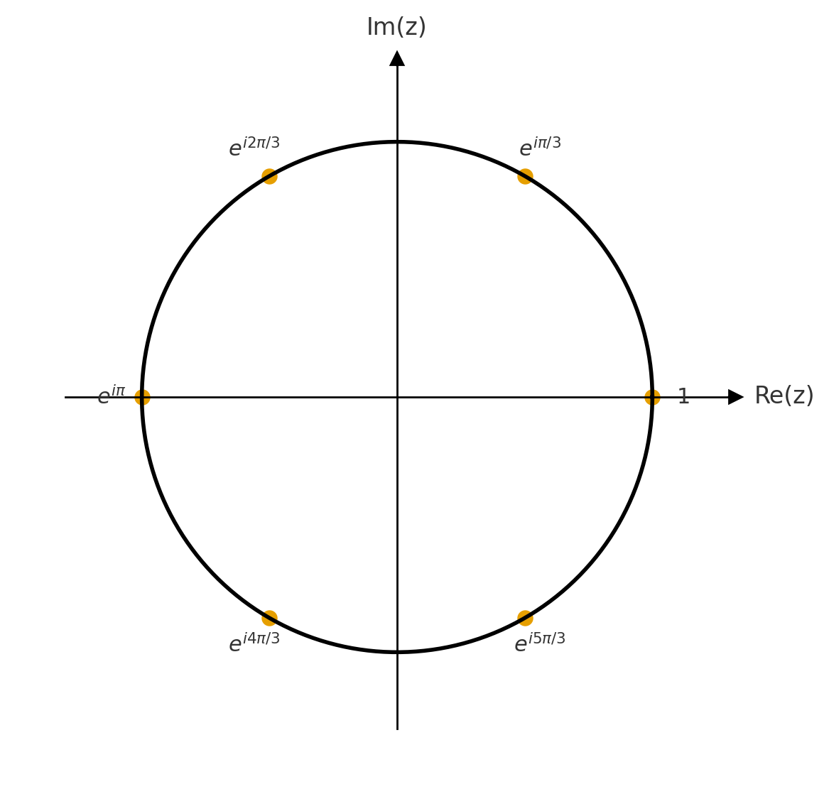 נשים לב כי יש הפרש קבוע בין הזוויות של השורשים. הפרש זה הוא \(\frac{2\pi}{n}\), ולכן אפשר לעבור משורש אחד לשורש הבא ע”י סיבוב נגד כיוון השעון בזווית זו. כאשר עושים זאת \(n\) פעמים, משלימים סיבוב שלם וחוזרים לנקודת ההתחלה. באופן כללי, לכל זווית \(\alpha\in\mathbb{R}\) כפל ב-\(e^{i\alpha}\) מתאים לסיבוב בזווית \(\alpha\) נגד כיוון השעון.