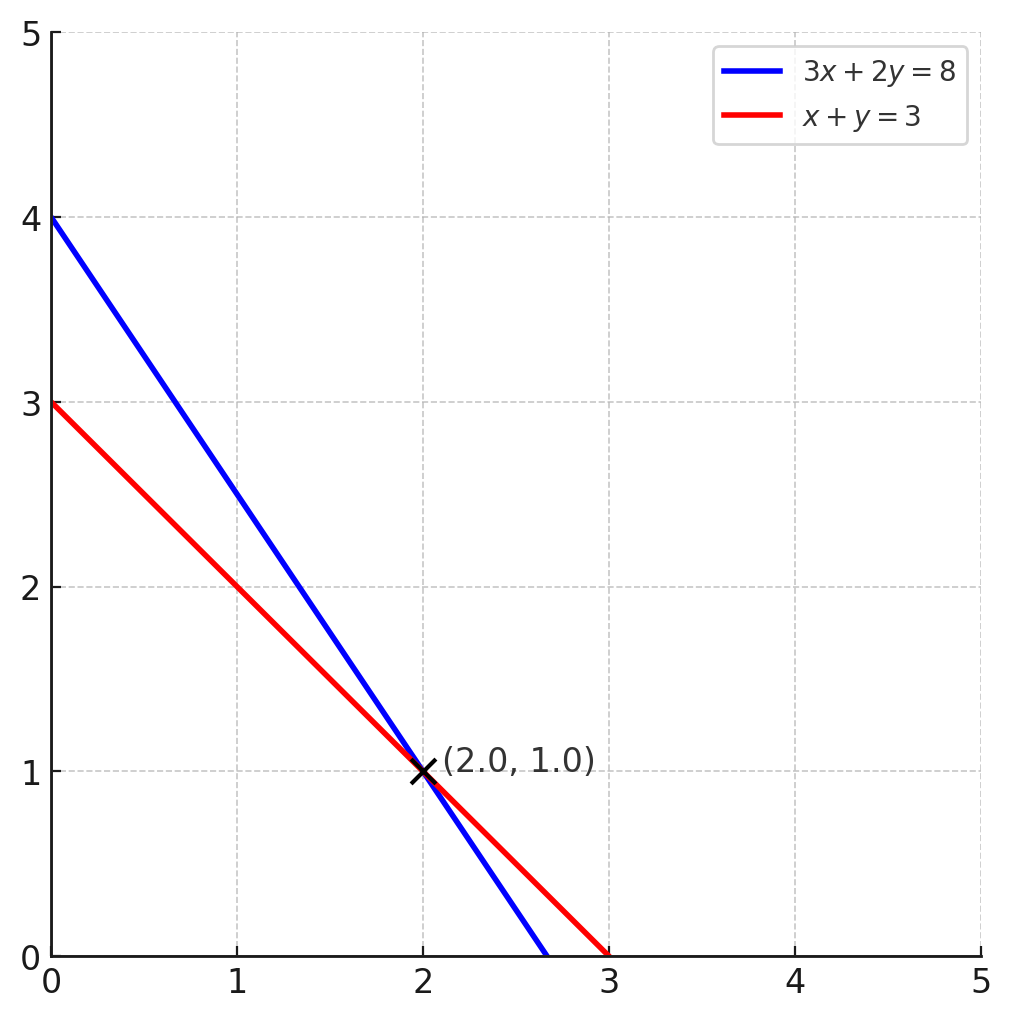 יש יותר מדרך אחת לפתור מערכת כזו, כמו להכפיל את המשוואה השנייה ב-\(2\) ואז להחסיר אותה מהמשוואה הראשונה. כך מקבלים \(x=2\) ולבסוף \(y=1\) ע”י הצבה באחת המשוואות. מבחינה גיאומטרית, כל משוואה מייצגת קו ישר במישור, ופתרון המערכת מוביל לנקודת החיתוך של שני הישרים.